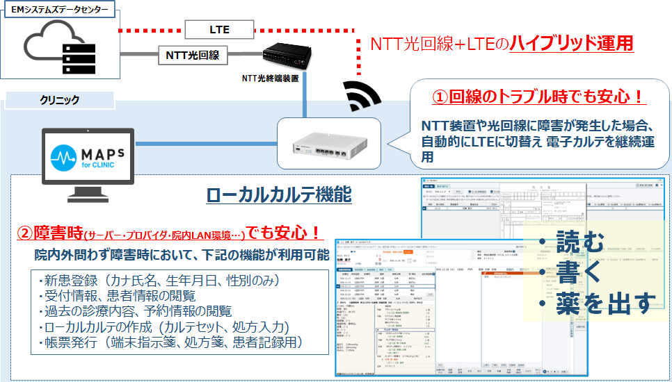 一般的にクラウドシステムは、ネットワーク障害時の復旧に時間を要します。MAPs for CLINICは、ネットワーク障害の自動検知と常時監視機能を備え、異常を検知すると瞬時に予備回線へ切り替え、カルテの継続利用を可能にします。
